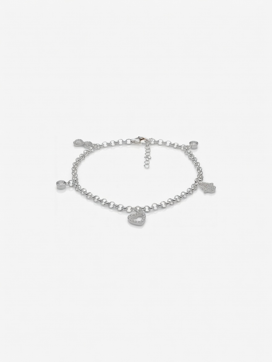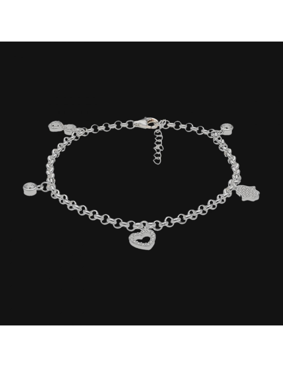 Pulsera en plata 925 rolo con dijes colgando corazón, infinito, mano y zirconias